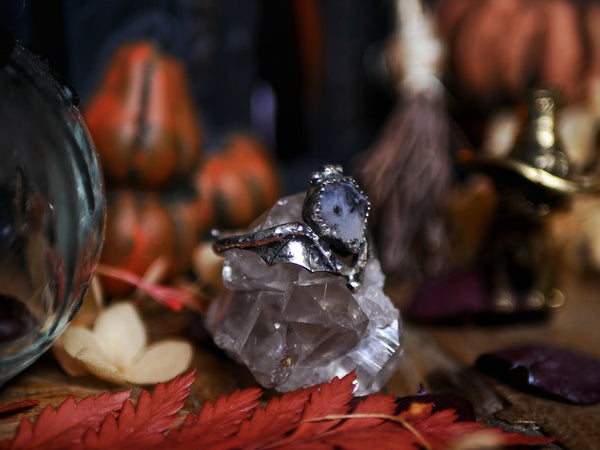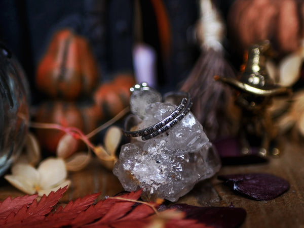 Ce modèle fait parti de la collection Joyaux de Samhain. Samhain marque la fin d’un cycle et l’entrée dans la saison sombre. C'est le moment où le voile entre les mondes devient plus fin. C'est un moment de transition, où l’on honore les ancêtres et où l’on célèbre la fin d’un cycle avant la renaissance. C’est cette énergie mystérieuse et sacrée que j’ai voulu capturer dans cette collection, entre ombre et lumière.