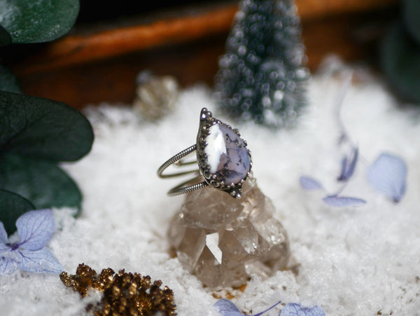 Cette bague en argent 925 est ornée d'une agate dendritique (ou merlinite). Son anneau est réglable.