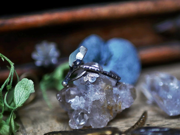 Cette bague fait partie de la Collection Art Nouveau. Elle est ornée d'une calcédoine facettée, son anneau est réglable, décoré de motifs. Elle est forgée et gravée à la main, avec des techniques de bijouterie traditionnelle.