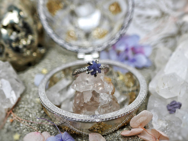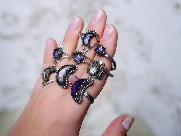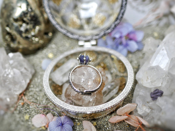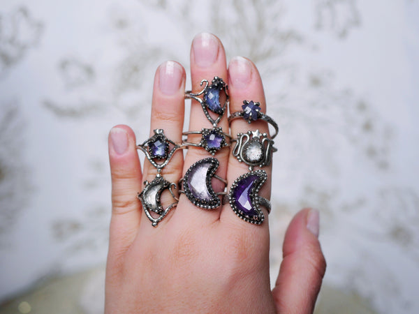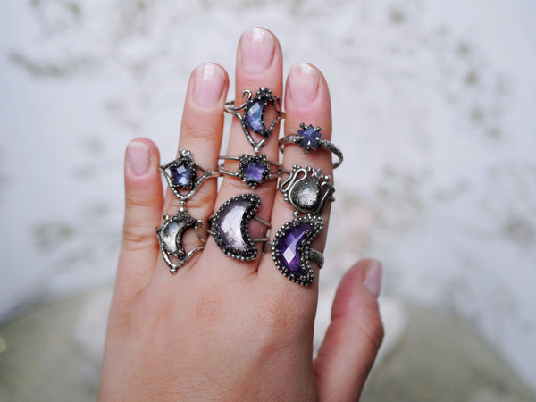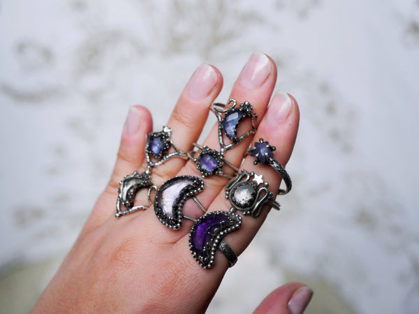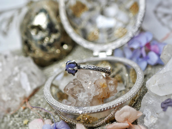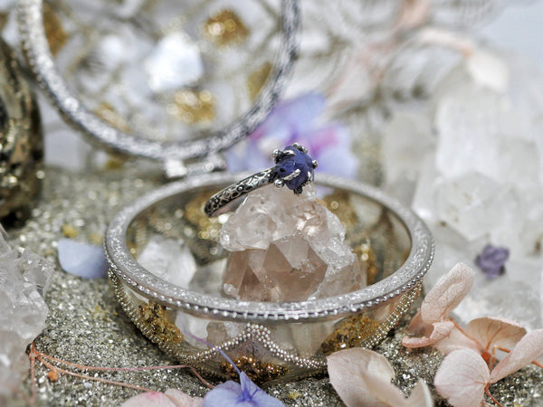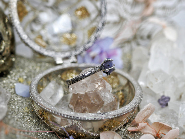 Cette bague est ornée d'une cordiérite taillée en forme d'étoile facettée, retenue par son serti griffe. Son anneau est réglable, tout est forgé à la main.