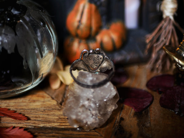 Ce modèle fait parti de la collection Joyaux de Samhain. Samhain marque la fin d’un cycle et l’entrée dans la saison sombre. C'est le moment où le voile entre les mondes devient plus fin. C'est un moment de transition, où l’on honore les ancêtres et où l’on célèbre la fin d’un cycle avant la renaissance. C’est cette énergie mystérieuse et sacrée que j’ai voulu capturer dans cette collection, entre ombre et lumière.