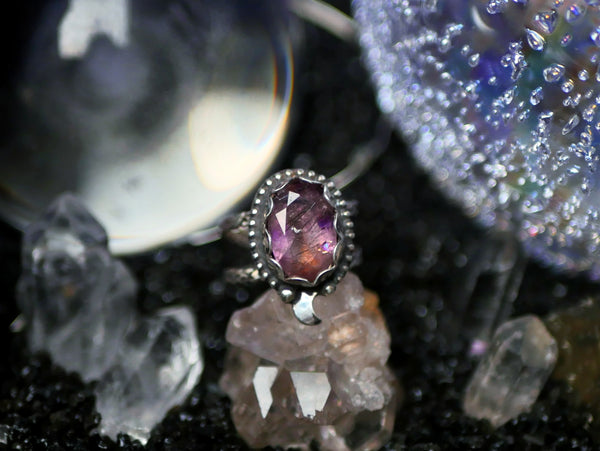 Cette bague en argent 925 est ornée d'une super seven facettée. Ses ornements ont été forgés à la main. Son anneau est texturé, il est réglable. Dimensions de la face avant de la bague : 21.7 x 14.6 mm