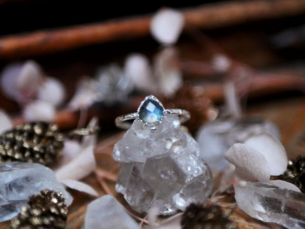 Cette bague en argent 925 est ornée d'une labradorite facettée, son anneau fin est martelé de motifs et est réglable. Une petite bille d'argent décore le serti.