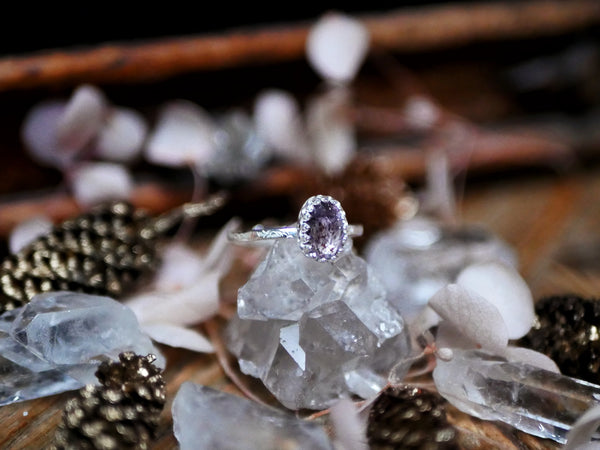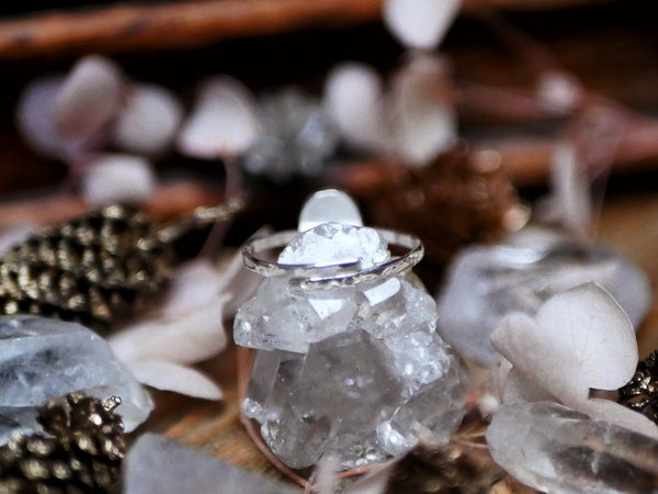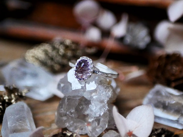 Cette bague en argent 925 est ornée d'une super seven facettée, son anneau fin est martelé de motifs et est réglable.