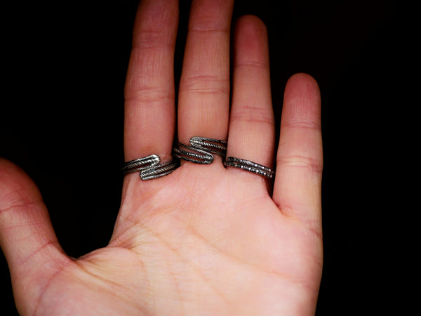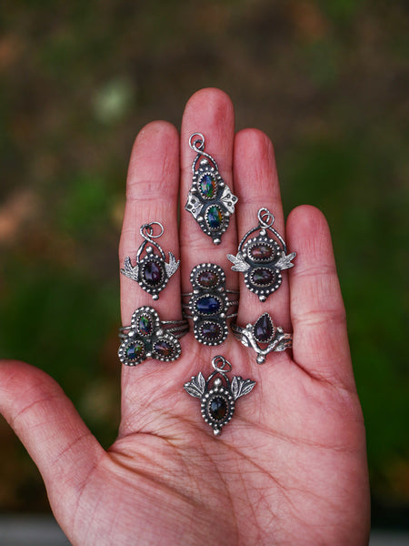 Cette bague en argent 925 est ornée d'un cabochon d'opale noire en forme de poire. Ce produit a été forgé à la main. Son anneau est texturé, il est réglable.