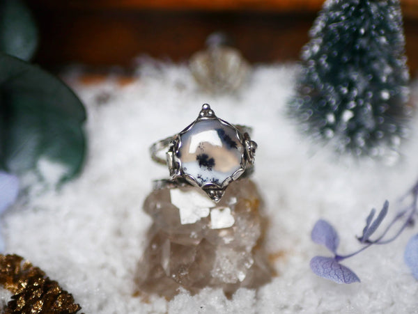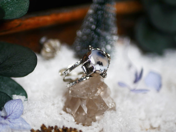 Cette bague en argent 925 est ornée d'une agate dendritique (ou merlinite). Son anneau est réglable. Cette bague est inspirée des bagues poison, elle dispose d'un petit compartiment pour y déposer ce que vous souhaitez, vous pourrez y cacher un petit secret, un mantra, une photo... Pour vous accompagner tout au long de la journée.