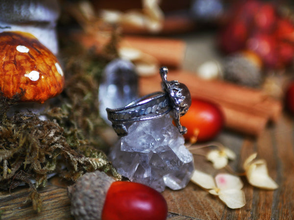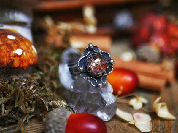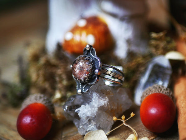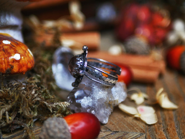 Cette bague est ornée d'un quartz chaman, son anneau est réglable, tout est forgé à la main.