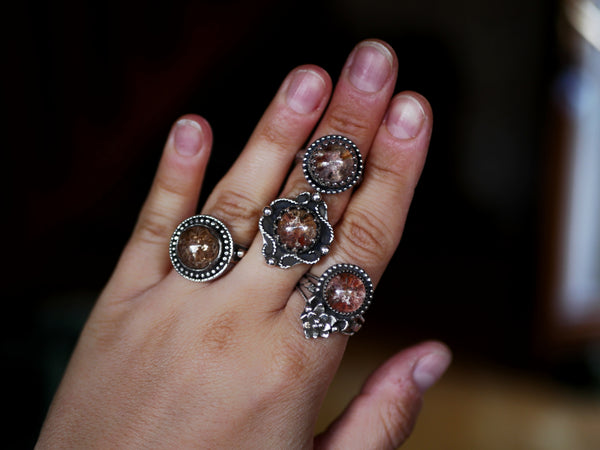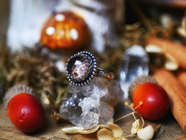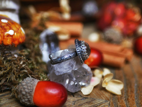 Cette bague est ornée d'un quartz chaman, son anneau est réglable, décoré de motifs.