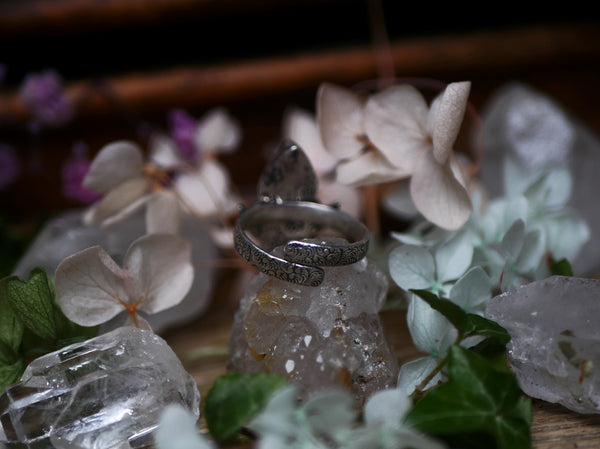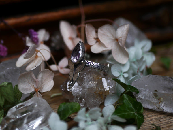 Cette bague en argent 925 est ornée d'une améthyste facettée, son anneau est réglable et décoré de motifs. Cette bague a été forgée à la main, les ailes de papillon ont été gravées à l'échoppe, à la main aussi.