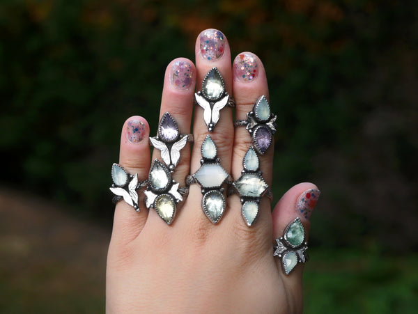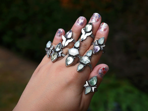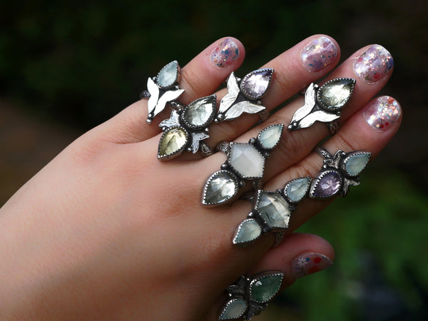 Le papillon s’est imposé naturellement, symbole de transformation, de renaissance, de liberté. J’ai choisi des pierres douces et lumineuses : quartz rose, prasiolite, améthyste, calcédoine, quartz citron, fluorine pour accompagner ces passages avec tendresse et clarté. Des bijoux pensés comme des talismans d’envol, pour celles qui traversent, changent, s’élèvent.