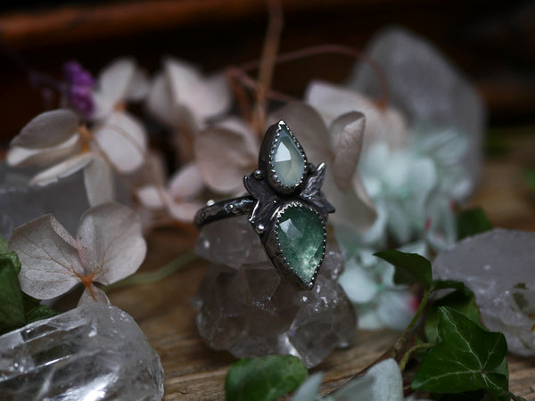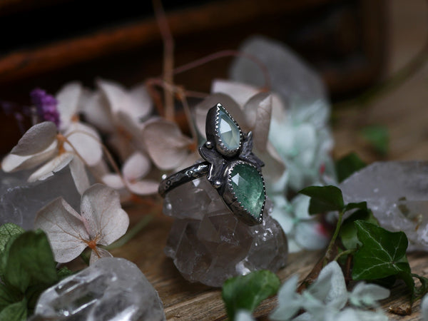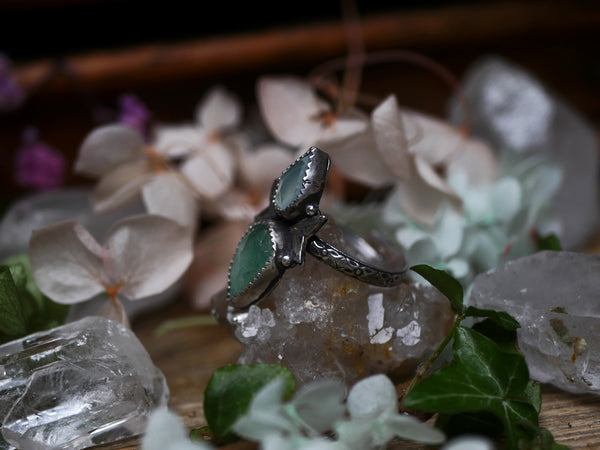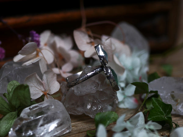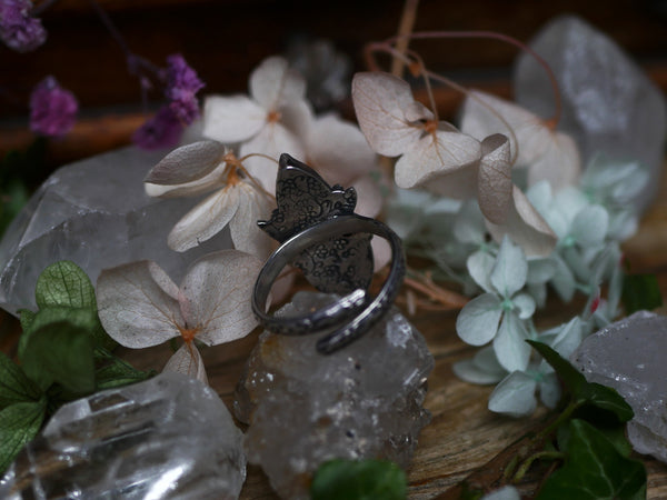 Cette bague en argent 925 est ornée d'une calcédoine aqua facettée et d'un tanzurine facettée, son anneau est réglable et décoré de motifs. Cette bague a été forgée à la main, les ailes de papillon ont été gravées à l'échoppe, à la main aussi.