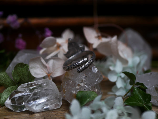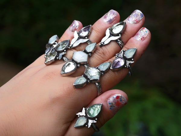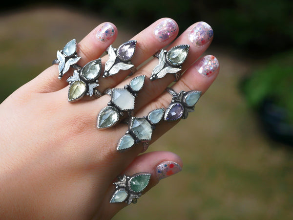 Le papillon s’est imposé naturellement, symbole de transformation, de renaissance, de liberté. J’ai choisi des pierres douces et lumineuses : quartz rose, prasiolite, améthyste, calcédoine, quartz citron, fluorine pour accompagner ces passages avec tendresse et clarté. Des bijoux pensés comme des talismans d’envol, pour celles qui traversent, changent, s’élèvent.