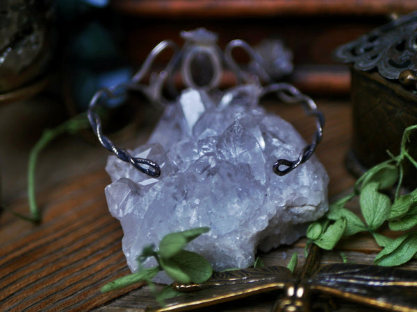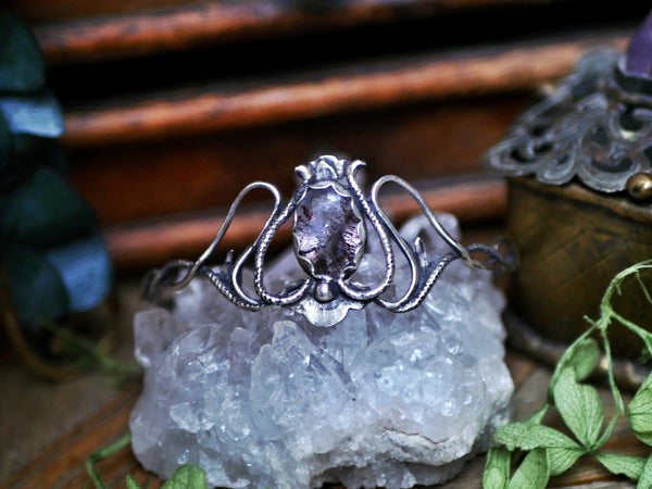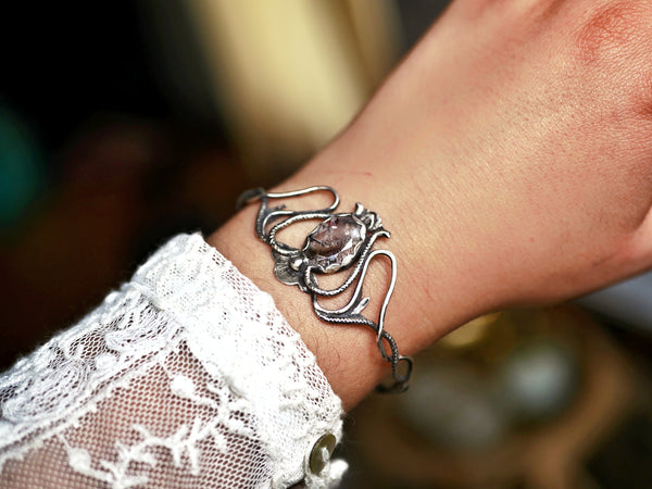 Ce bracelet type jonc ouvert fait partie de la Collection Art Nouveau. Il est orné d'une super seven facettée. Il est forgé et gravé à la main, avec des techniques de bijouterie traditionnelle.