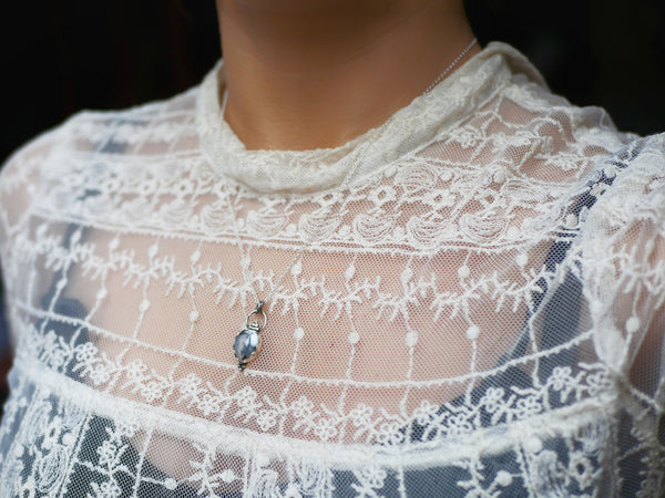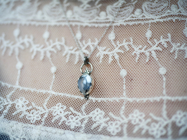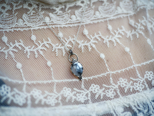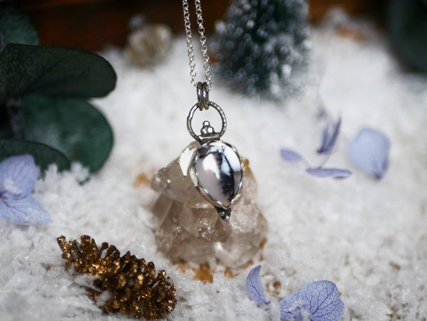 Ce collier en argent 925 est orné d'une agate dendritique (ou merlinite). Ce pendentif a été forgé à la main. Le collier se compose du pendentif ainsi que d'une chaine de 45 cm, elle aussi en argent 925. Le grand anneau est mobile.