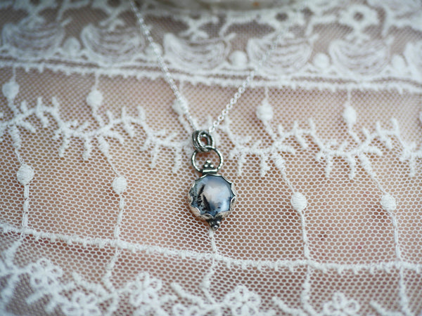 Ce collier en argent 925 est orné d'une agate dendritique (ou merlinite). Ce pendentif a été forgé à la main. Le collier se compose du pendentif ainsi que d'une chaine de 45 cm, elle aussi en argent 925. Le grand anneau est mobile.