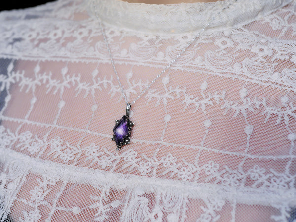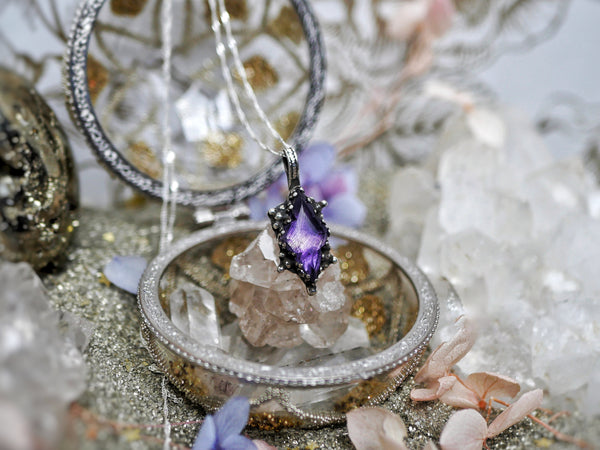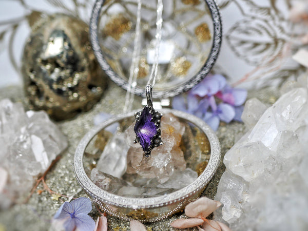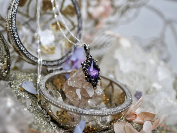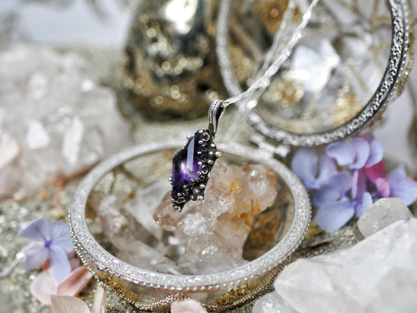 Cet élégant et discret collier est composé d'une améthyste taillée en forme d'étincelle, retenue par son serti clos. Le pendentif est monté sur une fine chaîne (45 cm), en argent 925. Ce bijou est issu de la Collection Céleste, inspirée par le ciel, les étoiles, les cycles et tout ce qui nous relie à quelque chose de plus grand que nous.