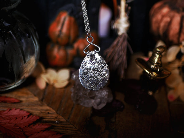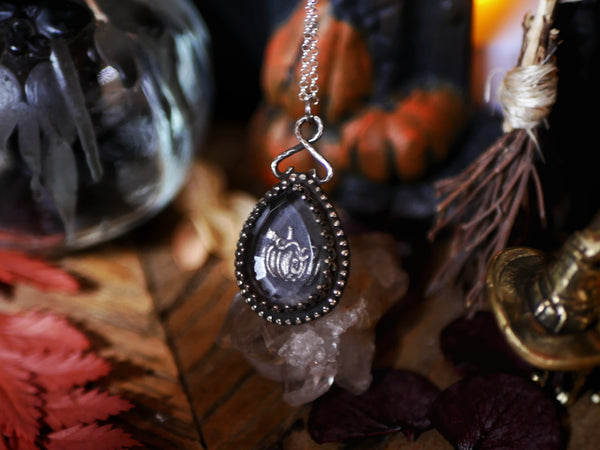 Ce modèle fait parti de la collection Joyaux de Samhain. Samhain marque la fin d’un cycle et l’entrée dans la saison sombre. C'est le moment où le voile entre les mondes devient plus fin. C'est un moment de transition, où l’on honore les ancêtres et où l’on célèbre la fin d’un cycle avant la renaissance. C’est cette énergie mystérieuse et sacrée que j’ai voulu capturer dans cette collection, entre ombre et lumière.