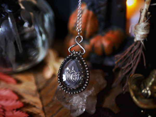 Ce collier en argent 925 est ornée d'un quartz clair facetté, il est forgé à la main. Sous le quartz se trouve une citrouille. Le pendentif est monté sur une chaîne de 45 cm, en argent 925 aussi.