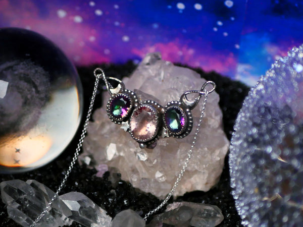 Ce collier en argent 925 est ornée d'une super seven et de deux topazes mystiques facettées. Ce pendentif a été forgé à la main. Le collier se compose du pendentif ainsi que d'une chaine de 45 cm, elle aussi en argent 925.