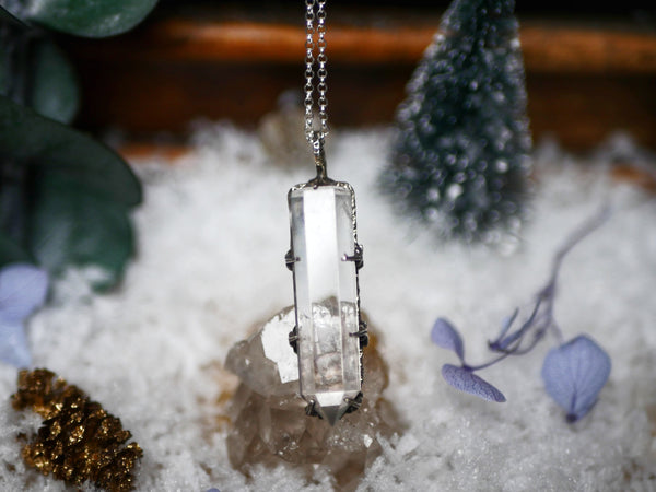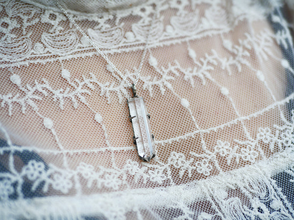 Ce collier en argent 925 est orné d'une pointe de quartz. Ce pendentif a été forgé à la main. Le collier se compose du pendentif ainsi que d'une chaine de 45 cm, elle aussi en argent 925. Le grand anneau est mobile.