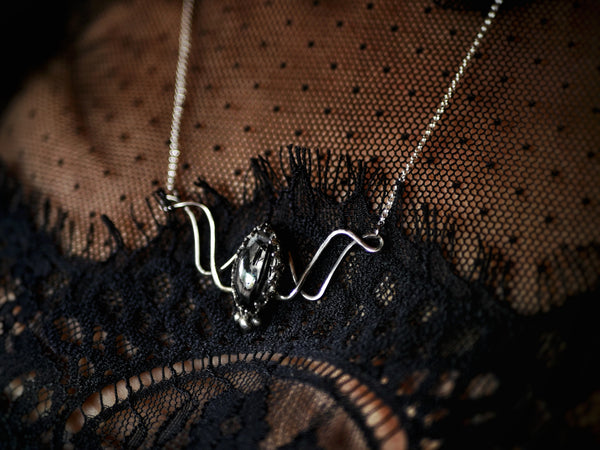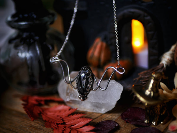 Ce modèle fait parti de la collection Joyaux de Samhain. Samhain marque la fin d’un cycle et l’entrée dans la saison sombre. C'est le moment où le voile entre les mondes devient plus fin. C'est un moment de transition, où l’on honore les ancêtres et où l’on célèbre la fin d’un cycle avant la renaissance. C’est cette énergie mystérieuse et sacrée que j’ai voulu capturer dans cette collection, entre ombre et lumière.
