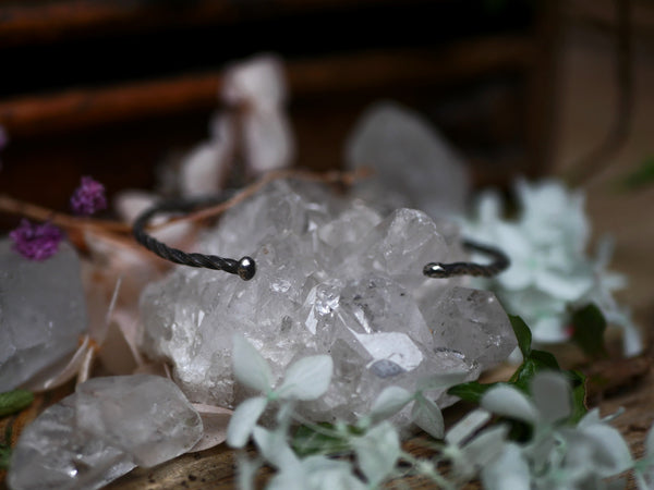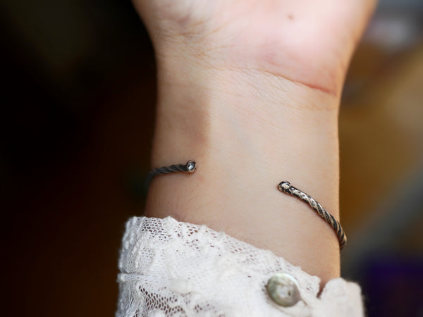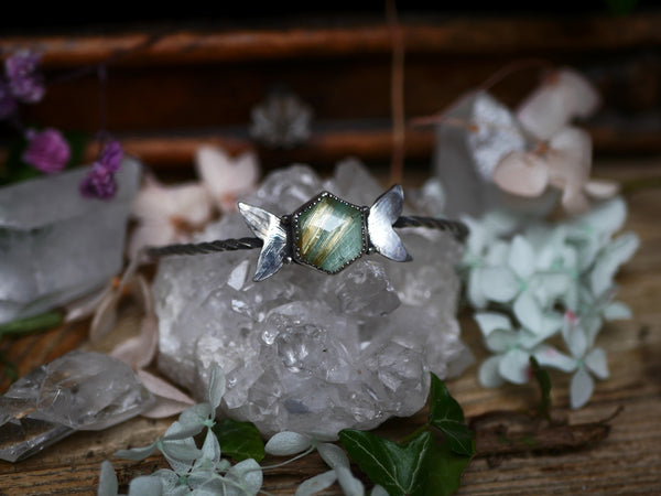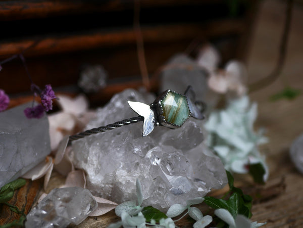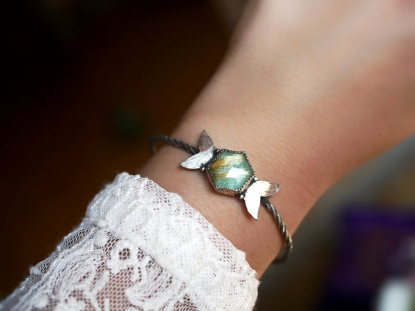 Ce bracelet type jonc ouvert est en argent 925 est orné d'un doublet d'amazonite & de quartz rutile facetté. Ce jonc a été forgé à la main, les ailes de papillon ont été gravées à l'échoppe, à la main aussi.