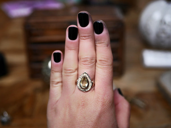 Cette bague est en vermeil (argent 925 plaqué or 14 cts 5 microns). Elle est ornée d'un quartz citron facetté, son anneau est réglable, tout est forgé à la main.