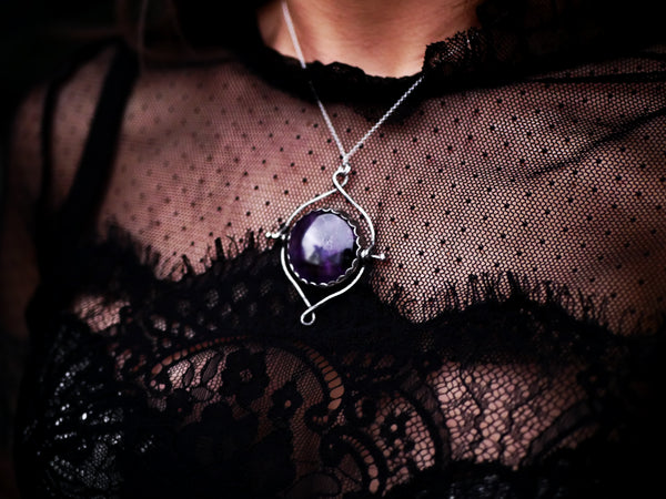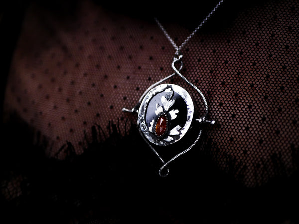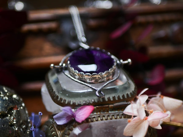 Ce talisman est réversible : une face avec une améthyste, et l'autre face une feuille gravée et orné d'une kyanite orange.